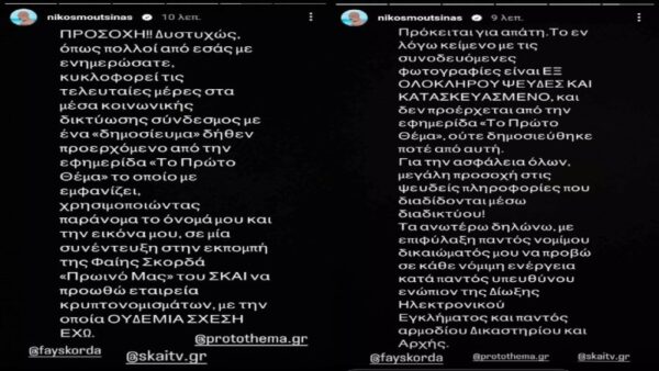 Πρόκειται για απάτη. Το εν λόγω κείμενο με τις συνοδευόμενες φωτογραφίες είναι εξ ολοκλήρου ψευδές και κατασκευασμένο. Και δεν προέρχεται από την εφημερίδα «Το Πρώτο Θέμα», ούτε δημοσιεύτηκε ποτέ από αυτή. Για την ασφάλεια όλων, μεγάλη προσοχή στις ψευδείς πληροφορίες που διαδίδονται μέσω διαδικτύου! Τα ανώτερο δηλώνω, με επιφύλαξη παντός νόμιμου δικαιώματος μου να προβώ σε κάθε νόμιμη ενέργεια κατά παντός υπευθύνου, ενώπιον της Δίωξης Ηλεκτρονικού Εγκλήματος και παντός αρμόδιου δικαστηρίου και αρχής» έγραψε μάλιστα ο Νίκος Μουτσινάς.