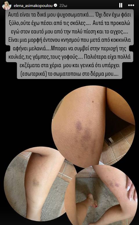 «Αυτά είναι τα δικά μου ψυχοσωματικά. Όχι δεν έχω φάει ξύλο, ούτε έχω πέσει από τις σκάλες. Αυτά τα προκαλώ εγώ στον εαυτό μου από την πολλή πίεση και το άγχος και αφήνει μελανιά. Μπορεί να συμβεί στην περιοχή της κοιλιάς, τις γάμπες, τους γοφούς. Παλαιοτέρα είχε πολλά εκζέματα στα χέρια μου και γενικά ότι υπάρχει εσωτερικά το σωματοποιώ στο δέρμα μου», αποκάλυψε η Έλενα Ασημακοπούλου.