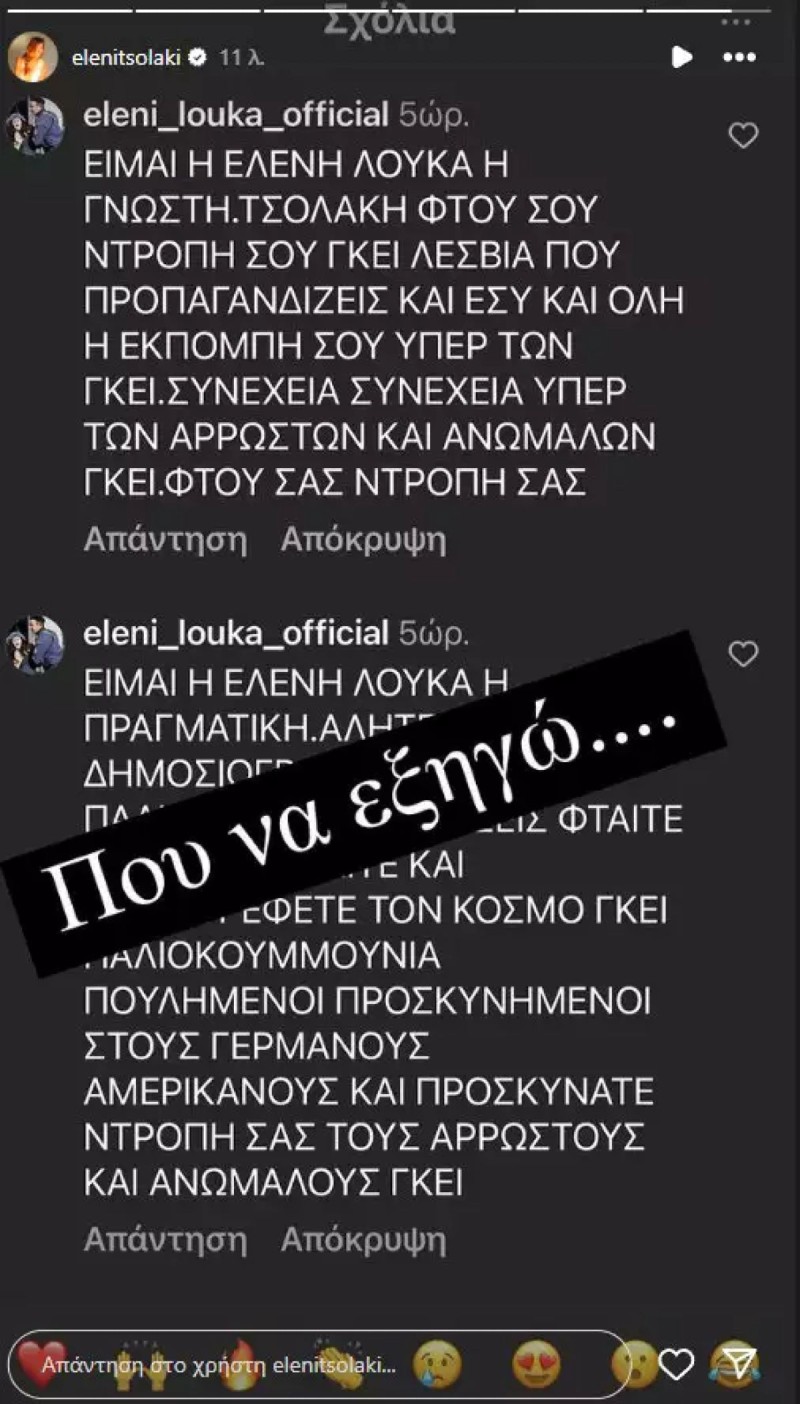 Τα σχόλια της Ελένης Λουκά συνεχίστηκαν με την παρουσιάστρια να μην απαντά δημοσίως. Λίγες ώρες αργότερα το βράδυ της Παρασκευής και η… Ελένη Τσολάκη κάνοντας story στο instagram τα σχόλια της Ελένης Λουκά αρκέστηκε στο να αναφέρει: «Πού να εξηγώ…»