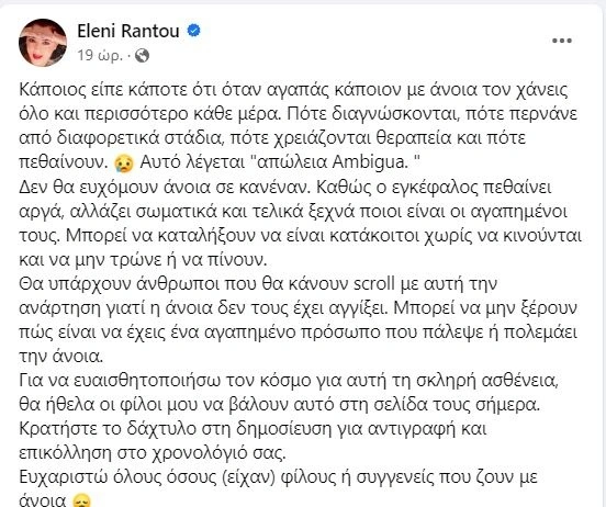Και όπως γράφει χαρακτηριστικά: «Κάποιος είπε κάποτε ότι όταν αγαπάς κάποιον με άνοια τον χάνεις όλο και περισσότερο κάθε μέρα. Πότε διαγνώσκονται, πότε περνάνε από διαφορετικά στάδια, πότε χρειάζονται θεραπεία και πότε πεθαίνουν. Αυτό λέγεται “απώλεια Ambigua. “Δεν θα ευχόμουν άνοια σε κανέναν. Καθώς ο εγκέφαλος πεθαίνει αργά, αλλάζει σωματικά και τελικά ξεχνά ποιοι είναι οι αγαπημένοι τους. Μπορεί να καταλήξουν να είναι κατάκοιτοι χωρίς να κινούνται και να μην τρώνε ή να πίνουν.
