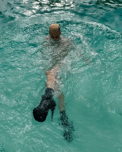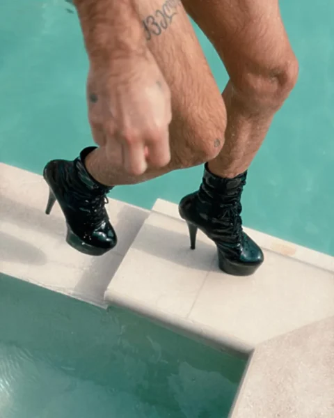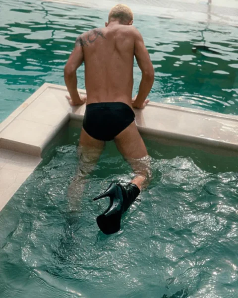 Ο χορευτής και χορογράφος πόζαρε στον φωτογραφικό φακό μέσα από μία πισίνα, φορώντας μαύρες ψηλοτάκουνες μπότες και ένα μαύρο μαγιό.
