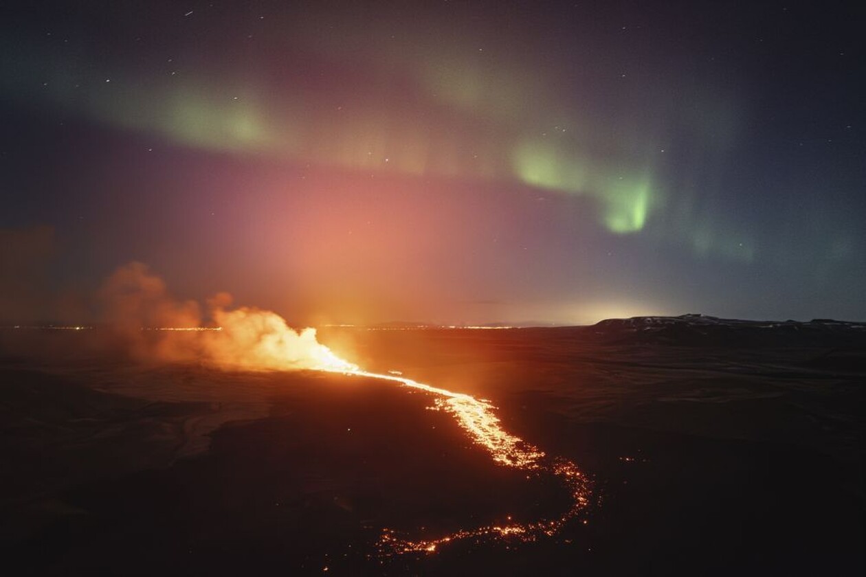 Την ώρα που το ηφαίστειο εκρήγνυται στην ισλανδική πόλη Γκρίνταβικ, οι βιντεογράφοι καταγράφουν το βόρειο σέλας.