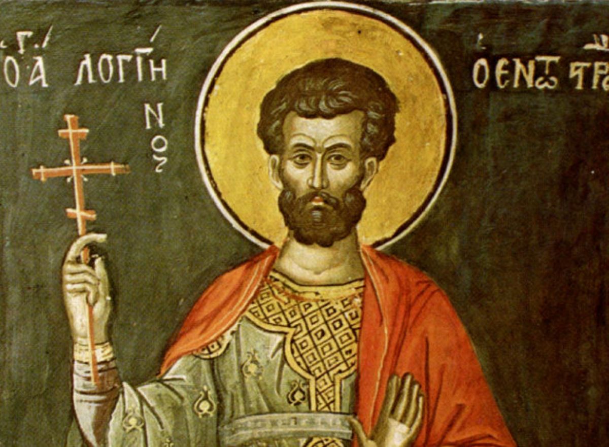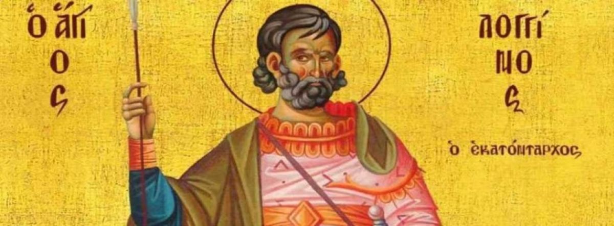Ο Άγιος Λογγίνος ήταν Εκατόνταρχος του Ποντίου Πιλάτου και υπηρετούσε στη Σταύρωση του Χριστού. Όταν αντίκρισε τα συγκλονιστικά σημεία (σεισμό, σχισμένες πέτρες) πίστεψε ότι ο σταυρωθείς ήταν ο Υιός του Θεού.