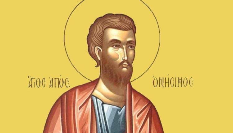 Σύμφωνα με τον συναξαριστή, ο Άγιος Ονήσιμος ήταν ένας από τους εβδομήντα Αποστόλους. Αρχικά υπήρξε δούλος του Ρωμαίου άρχοντα Φιλήμονα, ο οποίος είχε καταγωγή από τη Φρυγία και ασπάστηκε τον Χριστιανισμό από τον Απόστολο Παύλο. Ο Ονήσιμος εγκατέλειψε κρυφά τον κύριό του και ταξίδεψε στη Ρώμη. Όπου βρήκε τον Απόστολο Παύλο και αφιερώθηκε στο έργο της Εκκλησίας.