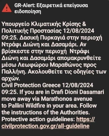 Λίγο πριν τις 09:30, το 112 έστειλε νέο μήνυμα, ζητώντας εκκένωση προς Παλλήνη. Το μήνυμα αναφέρει: «Υπάρχει δασική πυρκαγιά στην περιοχή σας. Αν βρίσκεστε σε Ντράφι, Διώνη και Δασαμάρι, απομακρυνθείτε μέσω της Λεωφόρου Μαραθώνος προς Παλλήνη».