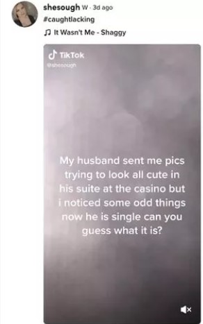 Η γυναίκα εξήγησε ότι ο σύζυγός της είχε κλείσει μια βραδιά σε ξενοδοχείο, με σκοπό να επισκεφθεί ένα καζίνο. Κατά τη διάρκεια της διαμονής του, της έστειλε μερικές φωτογραφίες από το μπάνιο της σουίτας του, προσπαθώντας να δείχνει χαριτωμένος. Ωστόσο, αυτό που αρχικά έμοιαζε με μια συνηθισμένη selfie αποδείχθηκε το τέλος της σχέσης τους.