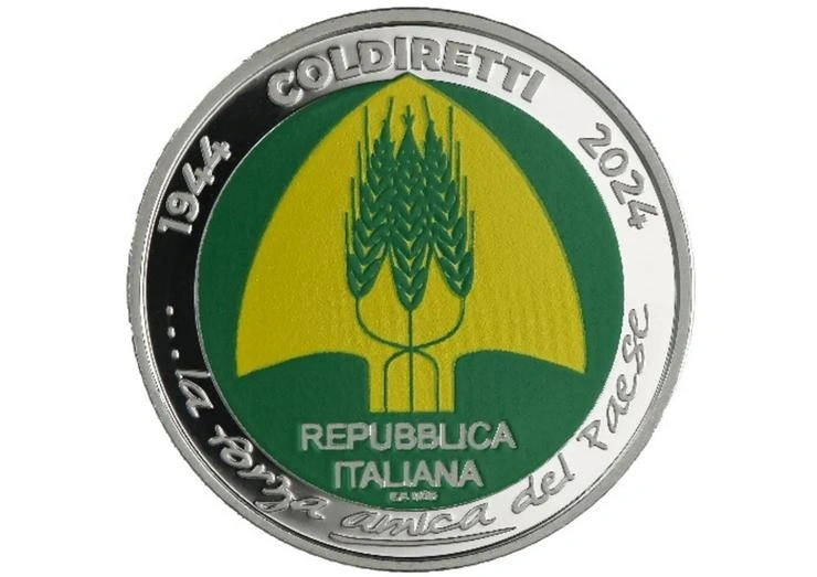 Το νόμισμα, σχεδιασμένο από τον καλλιτέχνη χαράκτη Emanuele Ferretti , είναι κατασκευασμένο από proof ασήμαντο και διαθέτει έναν πλούσιο σε νόημα σχεδιασμό. Στην εμπρόσθια όψη, το λογότυπο της Coldiretti – ένα κίτρινο φτυάρι σε πράσινο φόντο, με τρία στάχυα – συμβολίζει την αγροτική παράδοση και τη γονιμότητα της γης. Το σχέδιο πλαισιώνεται από τις περιόδους «1944» και «2024», που υπογραμμίζουν την επέτειο της Coldiretti, και τη φράση «…la forza amica del Paese», η οποία εκφράζει τον ρόλο της οργάνωσης ως «φίλης δύναμης» της Ιταλίας.