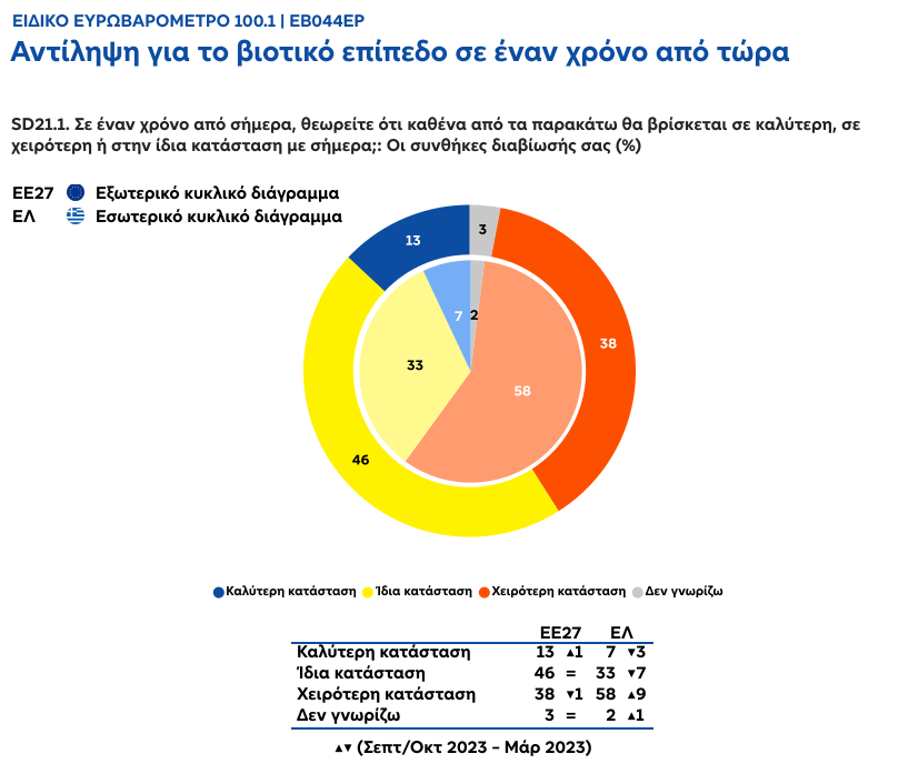 Σε ερώτηση του Ευρωβαρόμετρου σχετικά με το αν σε ένα χρόνο από τώρα θα έχει βελτιωθεί το βιοτικό επίπεδο τους, το 58% των Ελλήνων πιστεύουν πως θα βρίσκονται σε χειρότερη κατάσταση, το 33% θεωρούν πως θα είναι ίδια η κατάσταση, το 7% θεωρεί ότι θα βελτιωθεί το επίπεδο και το 2% δεν απάντησε στην ερώτηση.