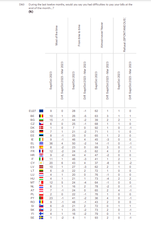 Σύμφωνα με το παρακάτω διάγραμμα, η ίδια ερώτηση έγινε στους πολίτες των 27 κρατών μελών της Ευρωπαϊκής Ένωσης. Με βάση τις απαντήσεις τους, οι χώρες με την μικρότερη αδυναμία πληρωμής είναι η Σουηδία με 6%, η Δανία με 7% και η Φινλανδία με 20%.
