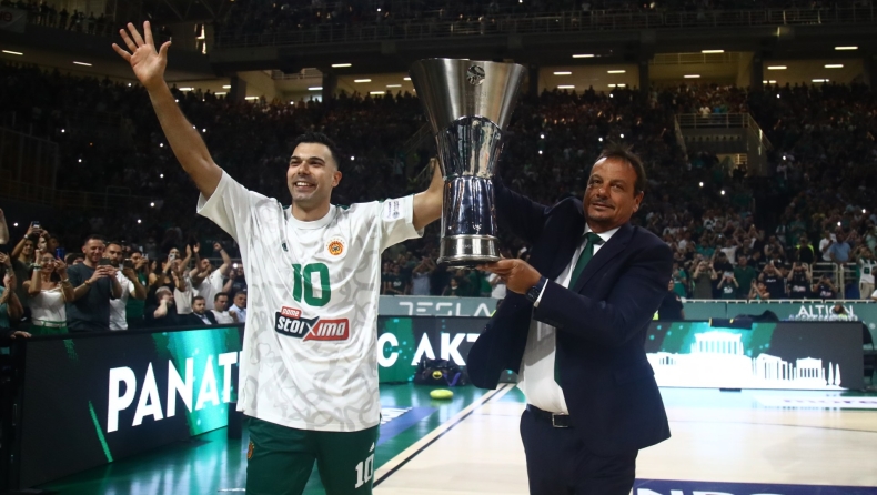 Ο προπονητής των πρωταθλητών Ευρώπης δημοσίευσε στο Instagram μια φωτογραφία από την εορταστική βραδιά με τα τρόπαια της Euroleague και της Basket League, στην οποία απεικονίζεται μαζί με τον Κώστα Σλούκα.