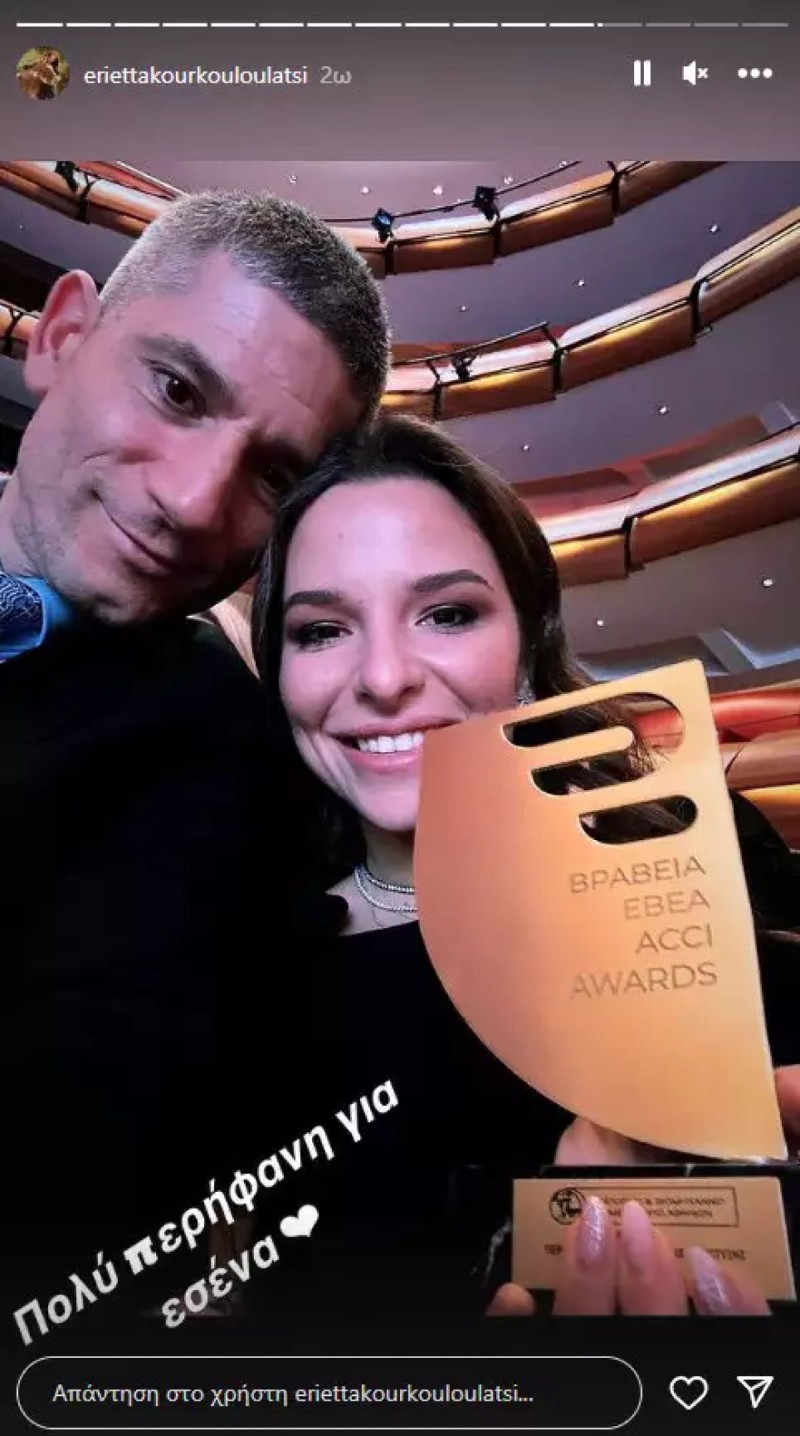 «Πολύ περήφανη για σένα» έγραψε η Εριέττα Κούρκουλου στην κοινή φωτογραφία με τον σύζυγό της μετά την απονομή.
