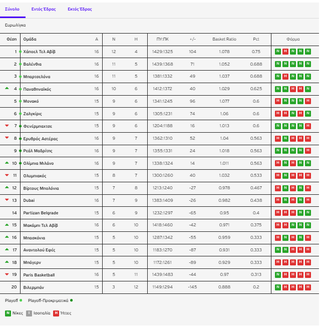 Ο Ολυμπιακός, με την ήττα από τη Βαλένθια (ρεκόρ 8-7), υποχώρησε στην 11η θέση, μένοντας προσωρινά εκτός της ζώνης των Playoffs.