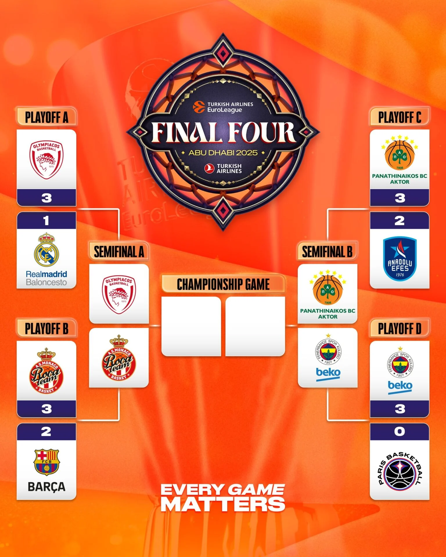 Έτσι, το τουρνουά του Final Four, που θα διεξαχθεί στην πρωτεύουσα των Ηνωμένων Αραβικών Εμιράτων, αναμένεται με ιδιαίτερο ενδιαφέρον, καθώς θα συγκεντρώσει τις τέσσερις καλύτερες ομάδες της Ευρώπης. Οι ημιτελικοί, που θα διεξαχθούν στις 23 Μαΐου, έχουν ως εξής: