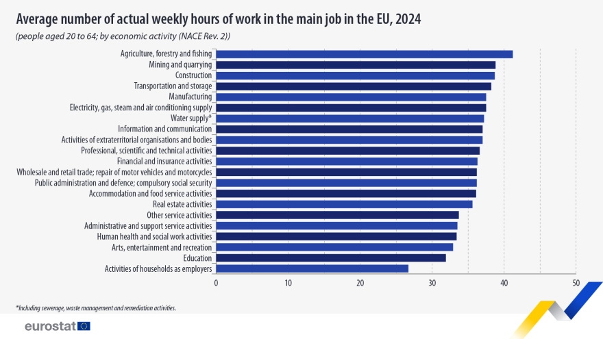 Η ίδια έρευνα της Eurostat κατέγραψε επίσης τους κλάδους με την μεγαλύτερη εβδομαδιαία διάρκεια εργασίας στην ΕΕ για το 2024.