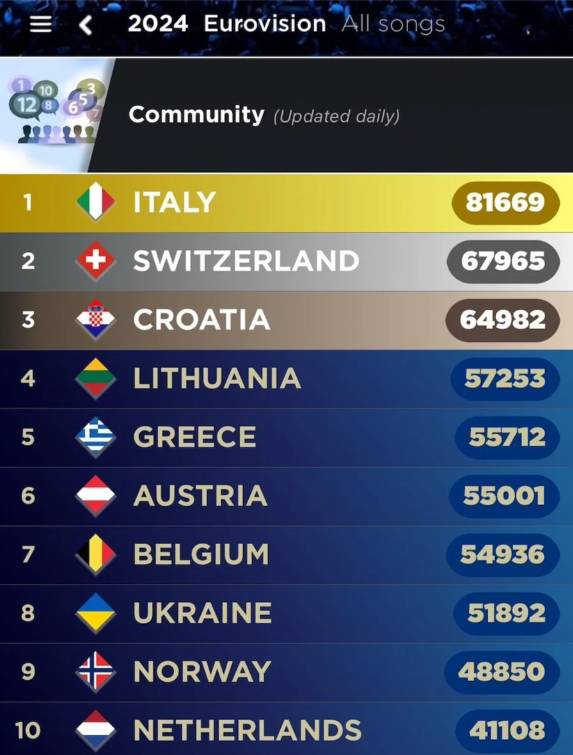 Επιπλέον σε μια από τις πιο δημοφιλείς εφαρμογές των Eurofans για τον διαγωνισμό της Eurovision 2024, που ονομάζεται «My Eurovision Scoreboard», η Ελλάδα πλασάρεται πολύ ψηλότερα στις προτιμήσεις έχοντας σκαρφαλώσει στην 5η θέση.