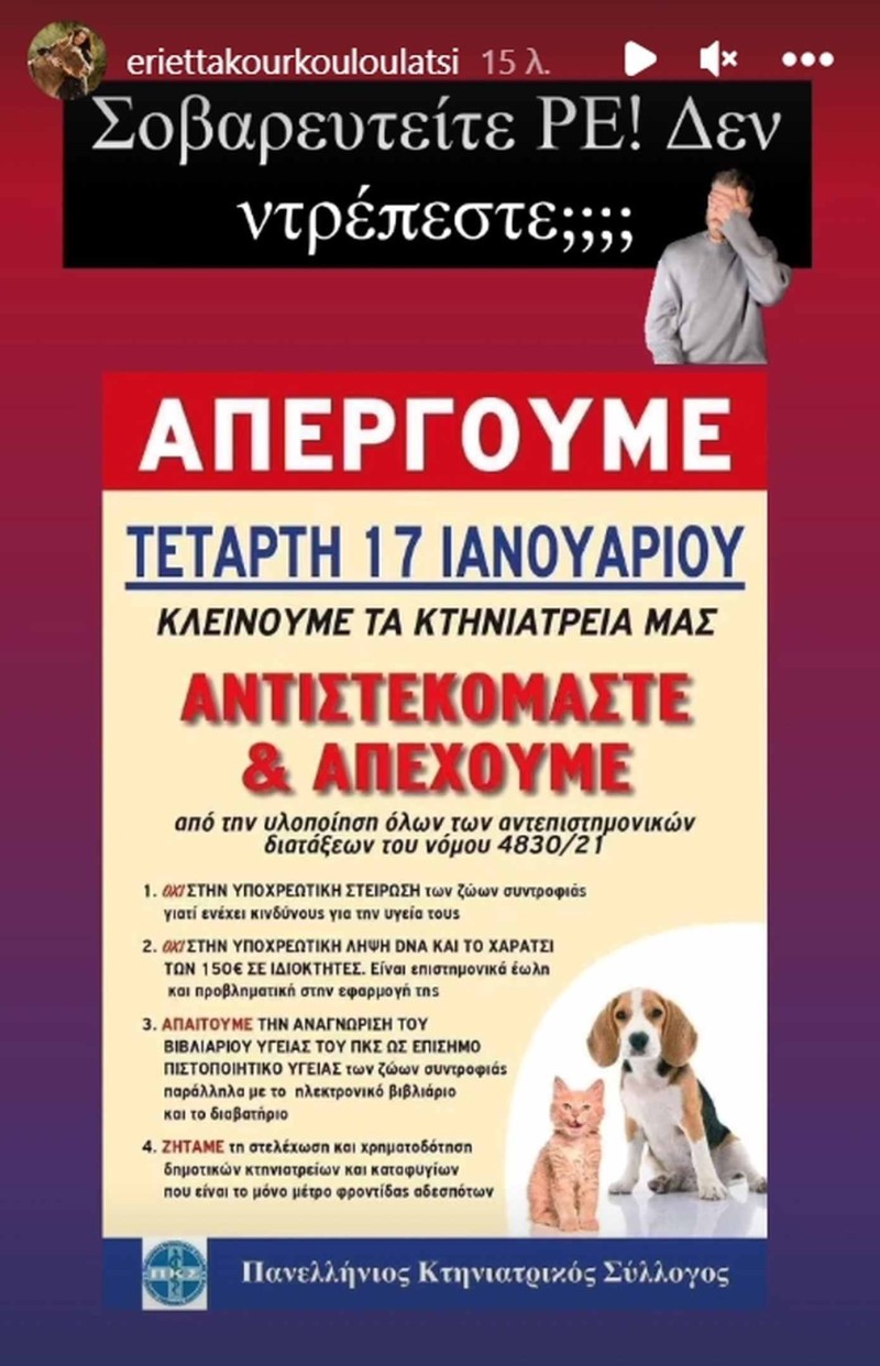 “Σοβαρευτείτε ΡΕ. Δεν ντρέπεστε;;;” γράφει η Κούρκουλου αναδημοσιεύοντας την ανακοίνωση του Πανελλήνιου Κτηνιατρικού Συλλόγου.