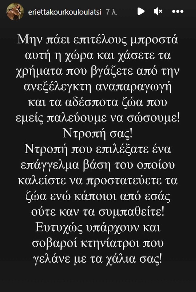 «Σοβαρευτείτε ρε, δεν ντρέπεστε; Μην πάει επιτέλους μπροστά αυτή η χώρα…» ανέφερε σε αναρτήσεις της η Εριέττα Κούρκουλου – Λάτση, η οποία βγήκε εκτός εαυτού με την απεργία των κτηνιάτρων.