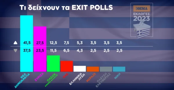Θρίαμβο της ΝΔ, με προβάδισμα που φτάνει τις 14 μονάδες έναντι του ΣΥΡΙΖΑ, καταγράφεται από την επεξεργασία του 100% των στοιχείων των exit polls.