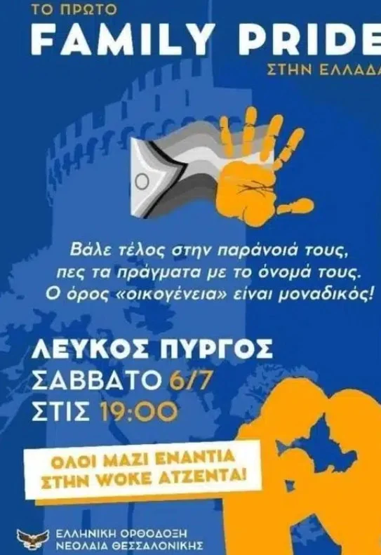 Family Pride: Η απάντηση της Ορθόδοξης Νεολαίας στο Euro Pride – Η Ελληνική Ορθόδοξη Νεολαία διοργανώνει το Family Pride ως αντίδραση στο Euro Pride που θα λάβει χώρα στη Θεσσαλονίκη, με την κορύφωση της εκδήλωσης του LGBTI κινήματος να περιλαμβάνει μια μεγάλη παρέλαση στις 29 Ιουνίου. Σύμφωνα με την ανακοίνωση, το Family Pride θα πραγματοποιηθεί στις 6 Ιουλίου στον Λευκό Πύργο, ενώ μια αντίστοιχη εκδήλωση θα γίνει και στην Αθήνα, στο Παλαιό Φάληρο, στο Μνημείο Υποβρυχίων.