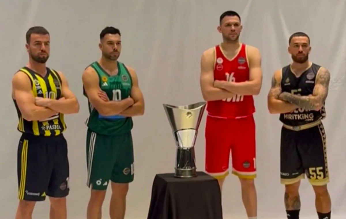 Οι αρχηγοί των τεσσάρων ομάδων του Final Four 2025 στο Άμπου Ντάμπι, Κώστας Σλούκας (Παναθηναϊκός), Κώστας Παπανικολάου (Ολυμπιακός), Μάικ Τζέιμς (Μονακό). Και Μελίχ Μαχμούτογλου (Φενέρμπαχτσε), φωτογραφήθηκαν όλοι μαζί με το τρόπαιο της EuroLeague.