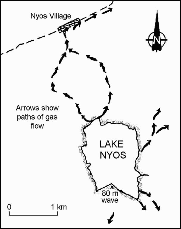 Εκείνη την εποχή, οι ερευνητές κατέληξαν στο συμπέρασμα ότι η λίμνη Nyos απελευθέρωσε μια τεράστια ποσότητα CO2 περίπου στις 9μμ κι επειδή το CO2 είναι βαρύτερο από τον περιβάλλοντα αέρα, κατακάθισε γρήγορα στις κοιλάδες γύρω, καλύπτοντας τα πάντα με ένα στρώμα τοξικού αερίου πάχους 50 μέτρων.