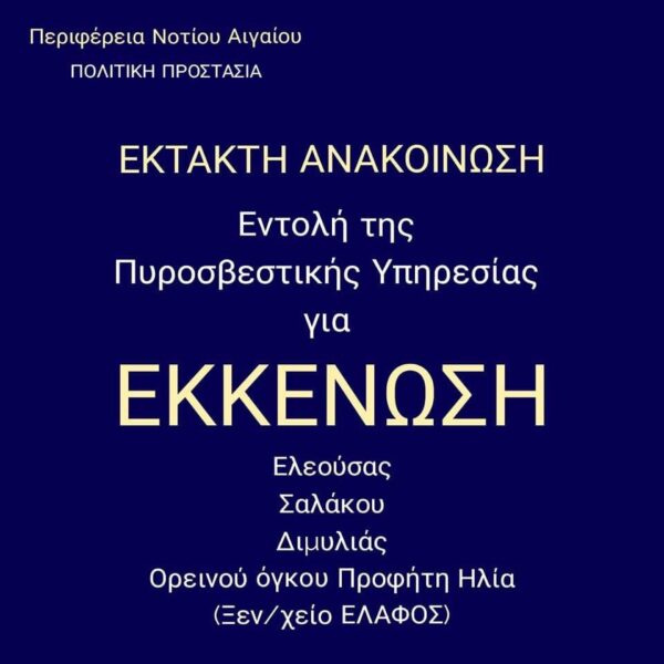 Προκειμένου να εξασφαλιστεί η ασφάλεια των κατοίκων της περιοχής, όπως γνωστοποιήθηκε και από την Πολιτική Προστασία της περιφέρειας Νοτίου Αιγαίου, η Πυροσβεστική Υπηρεσία έδωσε εντολή εκκένωσης Ελεούσας, Σαλάκου, Διμυλιάς, ορεινού όγκου Προφήτη Ηλία (Ξεν/χειο Ελαφος).