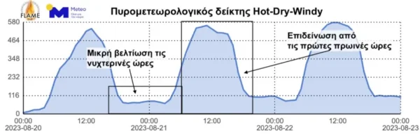 Με βάση τα τελευταία διαθέσιμα προγνωστικά στοιχεία της Πυρομετεωρολογικής Ομάδας FLAME της μονάδας METEO/EAA, οι πυρομετεωρολογικές συνθήκες στην ευρύτερη περιοχή της πυρκαγιάς αναμένεται να παρουσιάσουν μικρή βελτίωση κατά τη διάρκεια των νυχτερινών ωρών (20.08.2023/20:00 – 21.08.2023/04:00), επιδεινούμενες από τις πρώτες πρωινές ώρες της Δευτέρας.