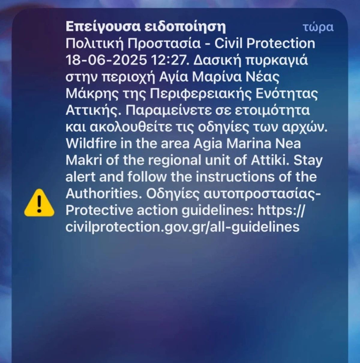 Πριν από λίγο, εστάλη μήνυμα από το 112 στους κατοίκους της περιοχής, καλώντας τους να παραμείνουν σε επιφυλακή.