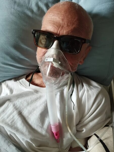 Ο Σπύρος Φωκάς αδυνατισμένος, φανερά καταβεβλημένος και με μάσκα οξυγόνου