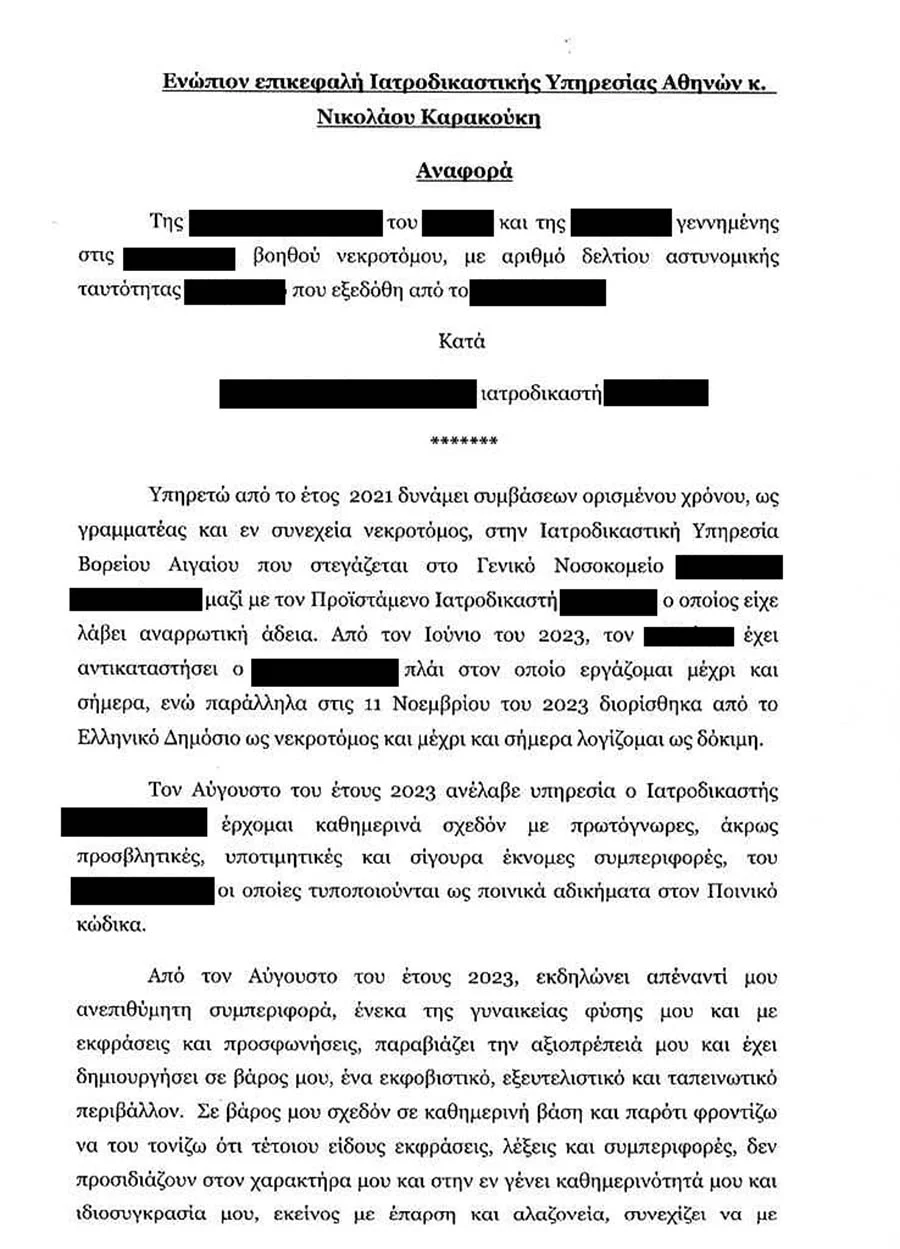 Η «Espresso» έχει στη διάθεσή της όλη την αναφορά της νεκροτόμου, στην οποία, μεταξύ άλλων, αναφέρει: «Ερχομαι καθημερινά με πρωτόγνωρες, άκρως προσβλητικές, υποτιμητικές και σίγουρα έκνομες συμπεριφορές του ιατροδικαστή, ο οποίος από τον Αύγουστο του έτους 2023 εκδηλώνει απέναντί μου ανεπιθύμητη συμπεριφορά ένεκα της γυναικείας φύσης μου και με εκφράσεις-προσφωνήσεις παραβιάζει την αξιοπρέπειά μου και έχει δημιουργήσει σε βάρος μου ένα εκφοβιστικό, εξευτελιστικό και ταπεινωτικό περιβάλλον σχεδόν σε καθημερινή βάση. Και παρότι φροντίζω να του τονίζω ότι τέτοιες συμπεριφορές δεν αρμόζουν στον χαρακτήρα μου και στην καθημερινότητά μου, εκείνος με έπαρση και αλαζονεία συνεχίζει να με προσβάλλει και να με εκθέτει με ανεπιθύμητη προς εμένα λεκτική και ψυχολογική συμπεριφορά σεξουαλικού περιεχομένου».