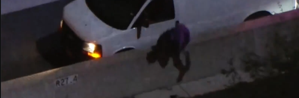 Το ελικόπτερο του CBS Los Angeles κατέγραφε τη δίωξη ενός άνδρα που οδηγούσε κλεμμένο βαν. Μόλις το όχημα επιβράδυνε στον αυτοκινητόδρομο 110 Freeway, ο οδηγός επιχείρησε να διαφύγει σκαρφαλώνοντας έξω από το παράθυρο.