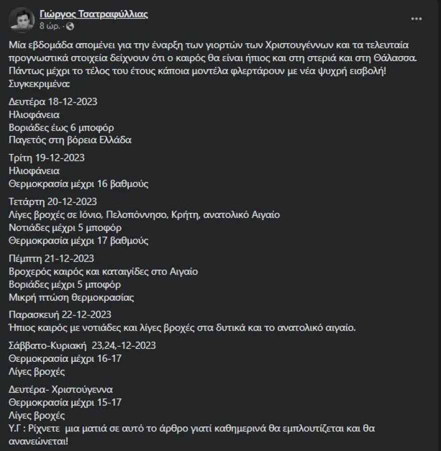 «Μία εβδομάδα απομένει για την έναρξη των γιορτών των Χριστουγέννων και τα τελευταία προγνωστικά στοιχεία δείχνουν ότι ο καιρός θα είναι ήπιος και στη στεριά και στη Θάλασσα. Πάντως μέχρι το τέλος του έτους κάποια μοντέλα φλερτάρουν με νέα ψυχρή εισβολή!», σημειώνει ο γνωστός μετεωρολόγος και παραθέτει στοιχεία για την προσεχή εβδομάδα: