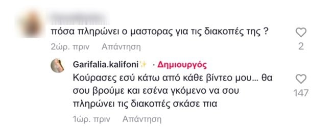 Η Γαρυφαλλιά Καληφώνη δεν το άφησε αναπάντητο, δίνοντας μια δημόσια και άμεση απάντηση: «Κούρασες εσύ κάτω από κάθε βίντεό μου… Θα σου βρούμε και εσένα γκόμενο να σου πληρώνει τις διακοπές. Σκάσε πια».