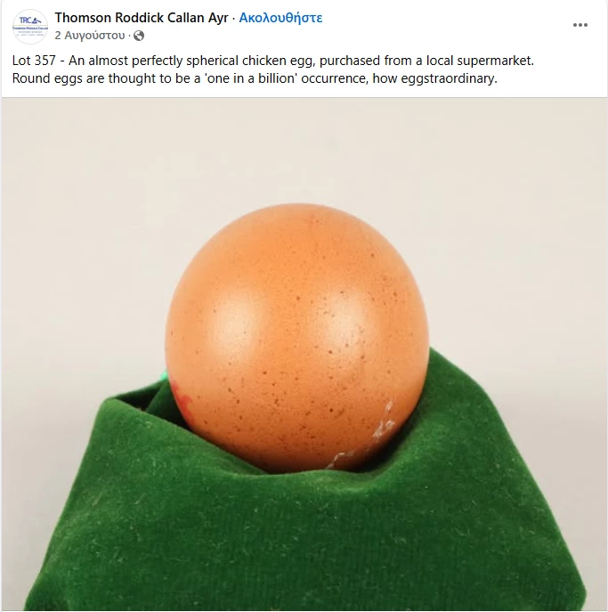 Γιατί αυτό το αυγό πουλήθηκε 240 ευρώ;… Ένα εξαιρετικά σπάνιο αυγό που διακρίνεται για το απόλυτα στρογγυλό σχήμα του πωλήθηκε σε δημοπρασία, προκαλώντας αίσθηση. Το ασυνήθιστο αυτό αυγό, που ανακαλύφθηκε τυχαία σε ένα σουπερμάρκετ στη Σκωτία, έφτασε στην εντυπωσιακή τιμή των 200 λιρών (περίπου 240 ευρώ), εξαιτίας της μοναδικότητάς του.