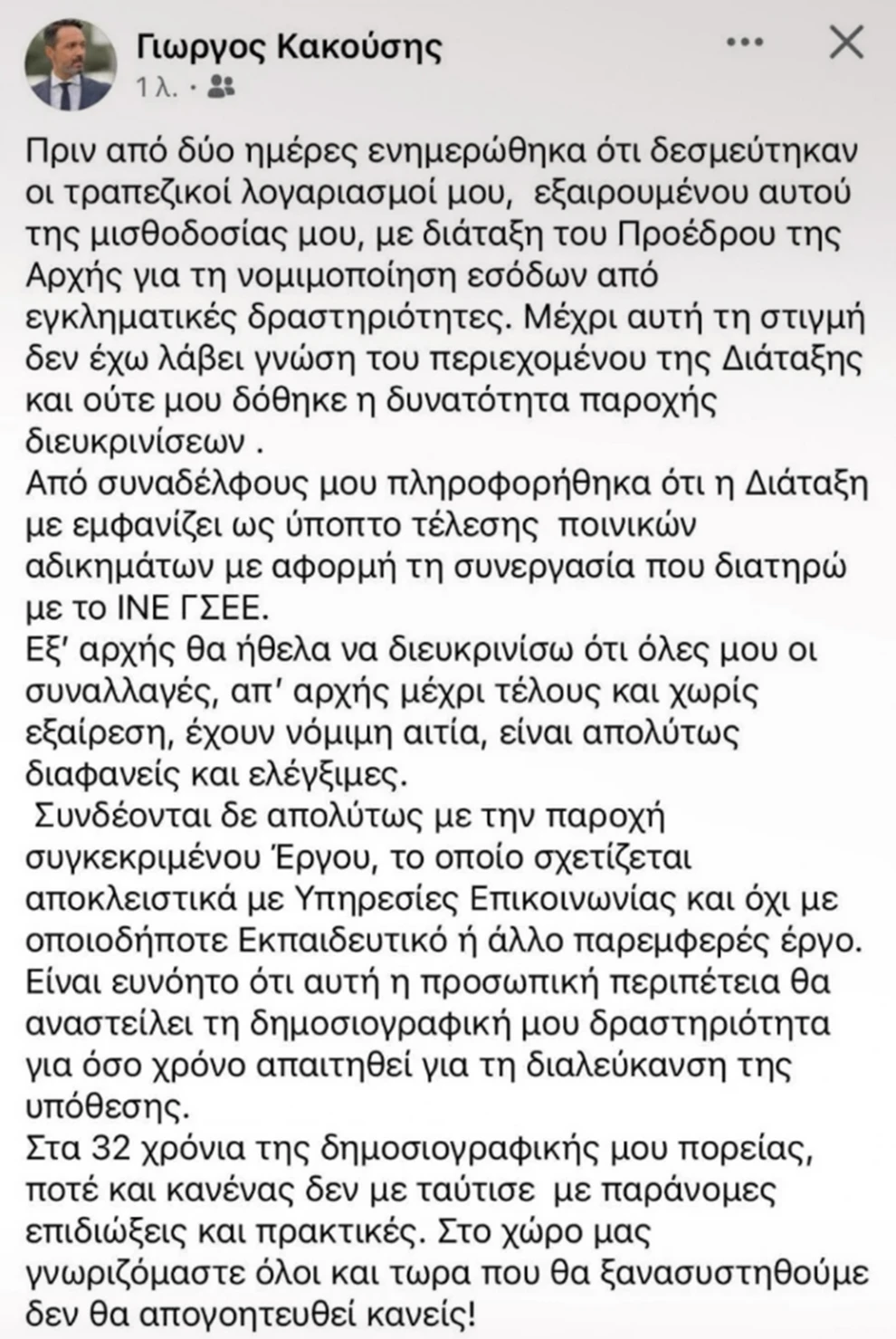 «Πριν από δύο ημέρες ενημερώθηκα ότι δεσμεύτηκαν οι τραπεζικοί λογαριασμοί μου, εξαιρουμένου αυτού της μισθοδοσίας μου, με διάταξη του Προέδρου της Αρχής για τη νομιμοποίηση εσόδων από εγκληματικές δραστηριότητες. Μέχρι αυτή τη στιγμή δεν έχω λάβει γνώση του περιεχομένου της Διάταξης και ούτε μου δόθηκε η δυνατότητα παροχής διευκρινίσεων.
