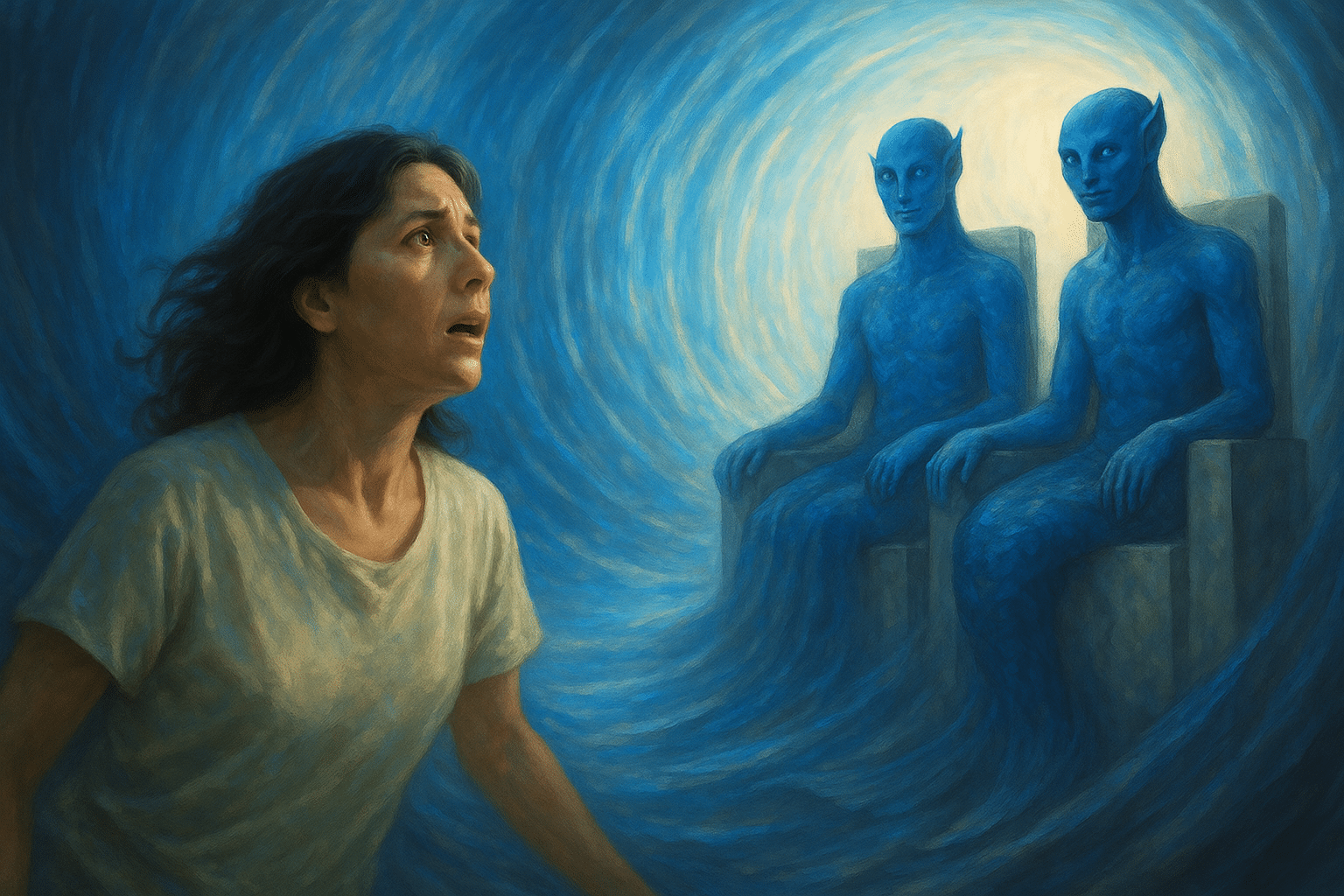Η 49χρονη περιέγραψε ότι ένιωσε να «τραβιέται» έξω από το σώμα της, εισερχόμενη σε ένα τούνελ μπλε και λευκού φωτός — έναν διάδρομο που της φάνηκε «ζωντανός».