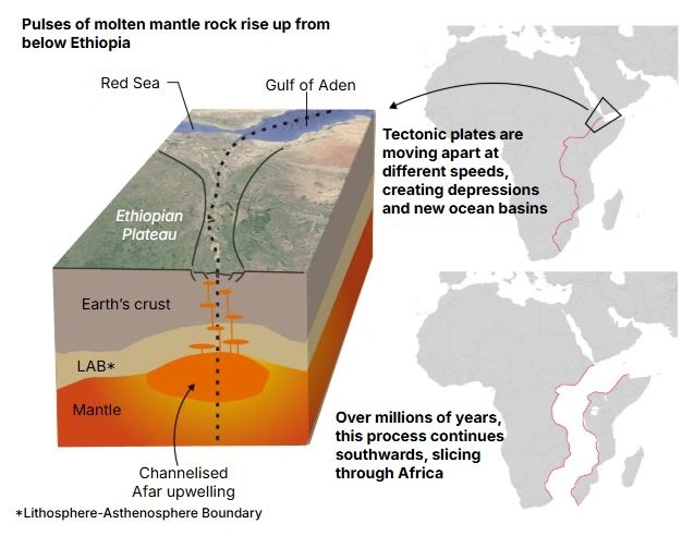 Οι επιστήμονες, χρησιμοποιώντας εξελιγμένα στατιστικά μοντέλα και γεωφυσικά δεδομένα, διαπίστωσαν ότι ο μανδύας της Γης κάτω από αυτή την περιοχή δεν είναι στατικός. Αντίθετα, «παλμάρει», δηλαδή παρουσιάζει ανερχόμενες κινήσεις λιωμένου πετρώματος που προκαλούν το σχίσιμο του φλοιού της Γης. Αυτό το τέντωμα και η λέπτυνση του φλοιού, που παρομοιάζεται με μια μαλακή πλαστελίνη που τεντώνεται, οδηγεί σταδιακά στο σπάσιμο της ηπείρος.