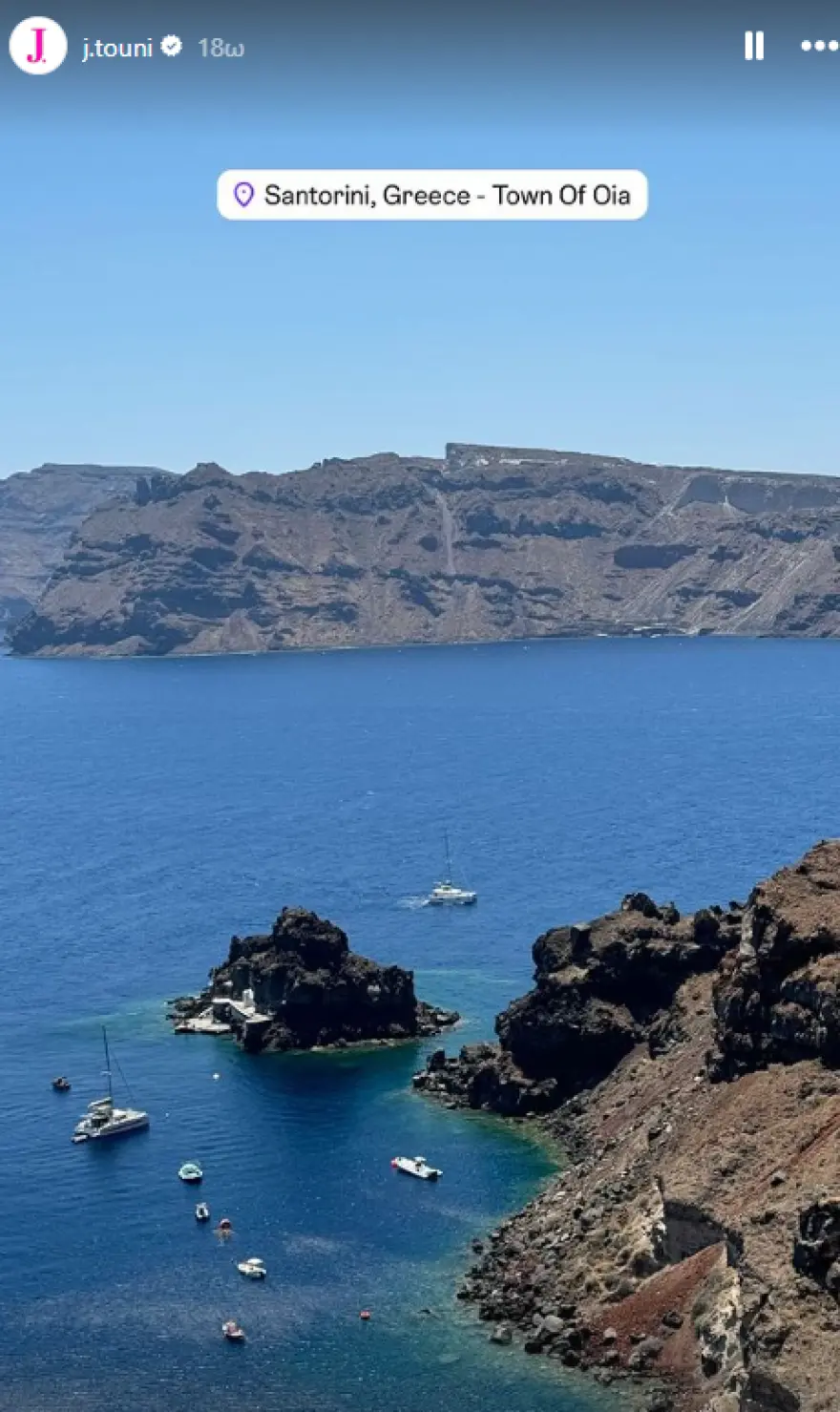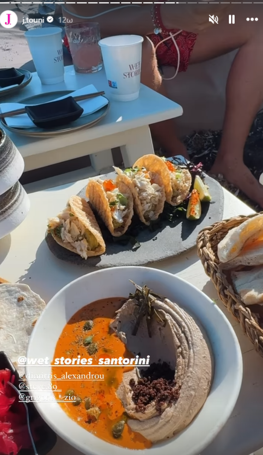 Απαθανάτισε επίσης τον Δημήτρη Αλεξάνδρου και τον γιο τους, όπως και μερικούς φίλους τους σε κάποια παραλία, και έδειξε διάφορα τοπία της Σαντορίνης και το γεύμα που απόλαυσε και και το πόσο απολαμβάνει τις στιγμές της στην ιδιωτική πισίνα του καταλύματος, όπου μένει.