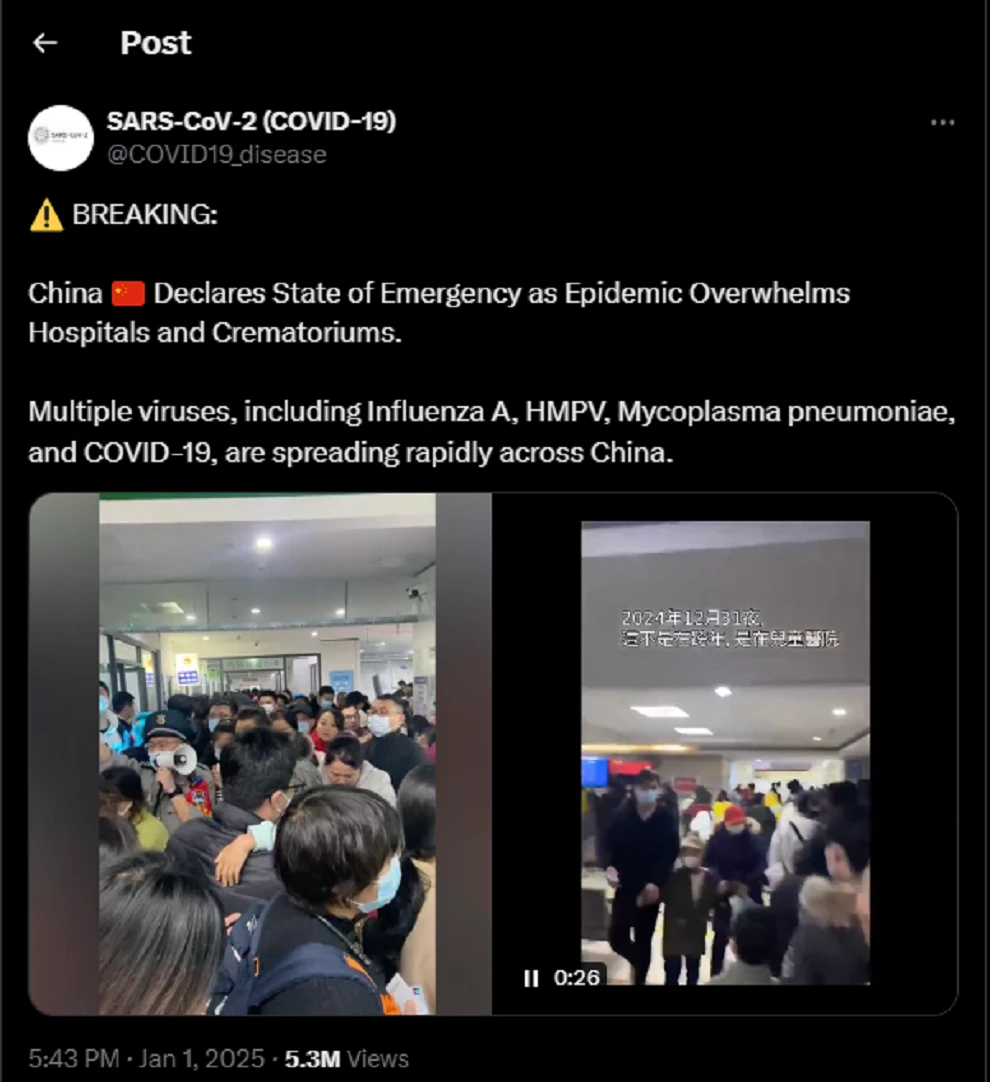 Σύμφωνα με αυτές τις αναρτήσεις, νοσοκομεία και κρεματόρια γέμισαν από ασθενείς με κορωνοϊό, γρίπη, ανθρώπινο μεταπνευμοϊό, καθώς και “άγνωστες αναπνευστικές ασθένειες”. Οι ισχυροί συνοδεύονταν από φωτογραφίες και βίντεο που φέρονταν να δείχνουν την κατάσταση.