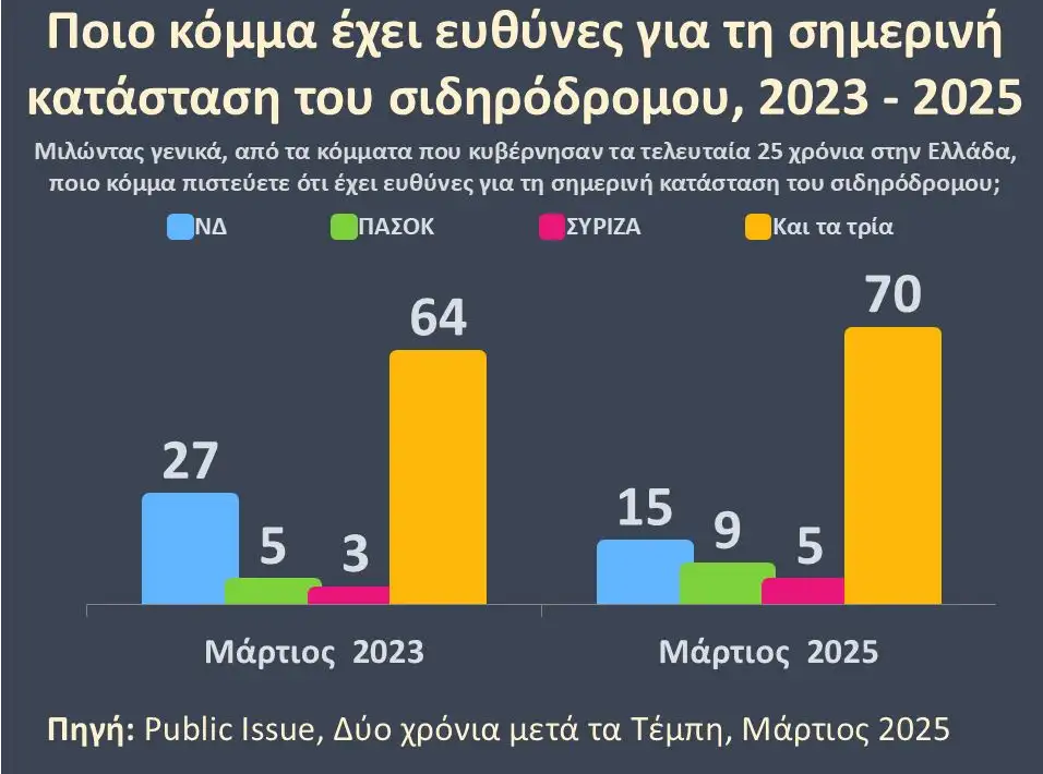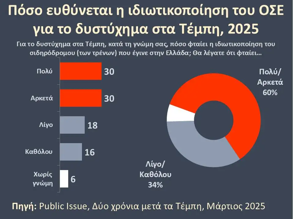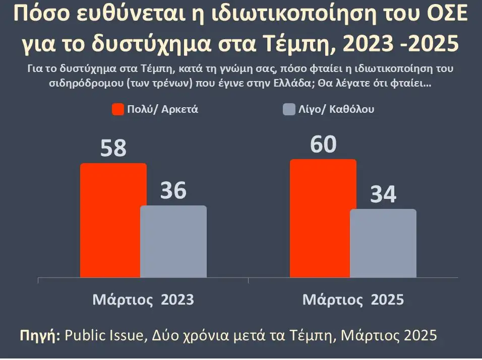Το 60% των πολιτών πιστεύει ότι για το σιδηροδρομικό δυστύχημα στα Τέμπη φταίει η ιδιωτικοποίηση του ΟΣΕ.