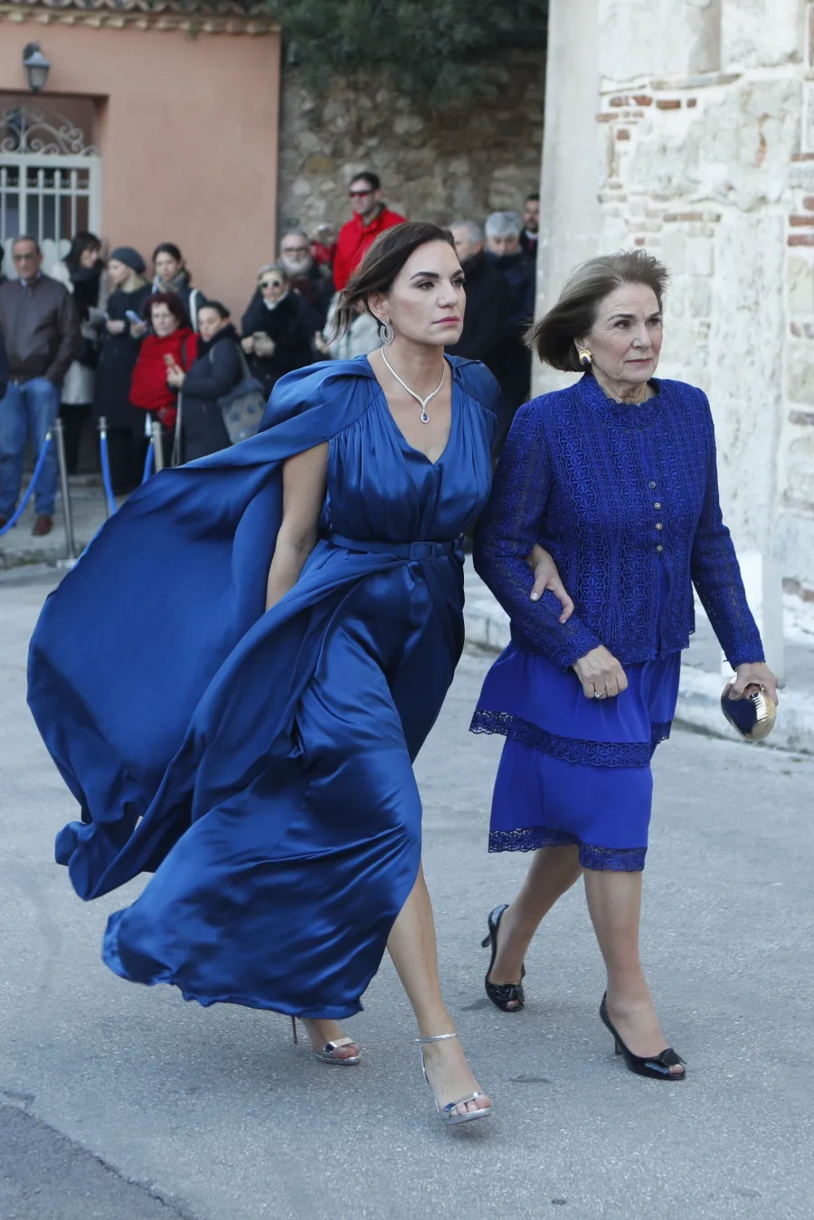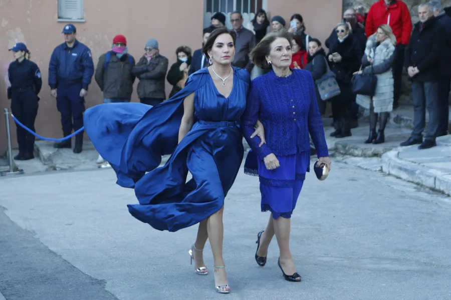 Η Όλγα Κεφαλογιάννη και η μητέρα της επέλεξαν να εμφανιστεί στο γάμο φορώντας σύνολα σε μπλε ρουά, ένα χρώμα που παραπέμπει σε βασιλική κομψότητα και κύρος. Η υπουργός εντυπωσίασε με ένα maxi saten cape φόρεμα, το οποίο αγκάλιαζε αρμονικά τη σιλουέτα της, αποπνέοντας ταυτόχρονα φινέτσα και αρχοντική γοητεία. Το look της ολοκληρώθηκε με minimal κοσμήματα και ένα chic clutch bag, που αναδείκνυαν την κομψότητα και το διαχρονικό της στυλ.