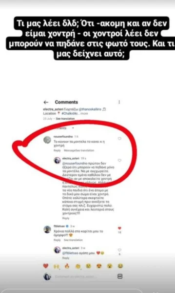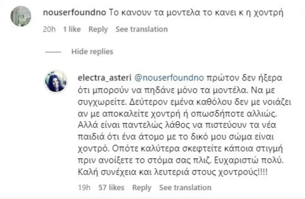 Το σχόλιο που έκανε ένας λογαριασμός και το οποίο τράβηξε την προσοχή της έγραφε το εξής: «Το κάνουν τα μοντέλα το κάνει και η χοντρή».