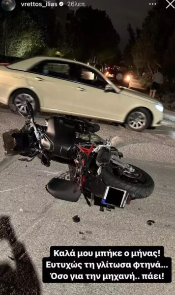 Τροχαίο ατύχημα είχε το βράδυ της Παρασκευής 2/11 ο Ηλίας Βρεττός με τη μηχανή στην περιοχή της Γλυφάδας.