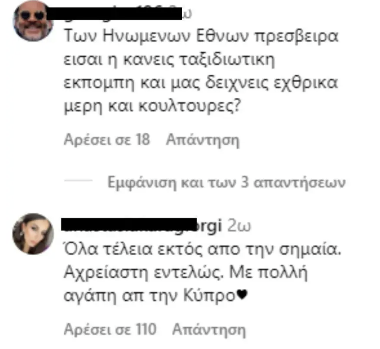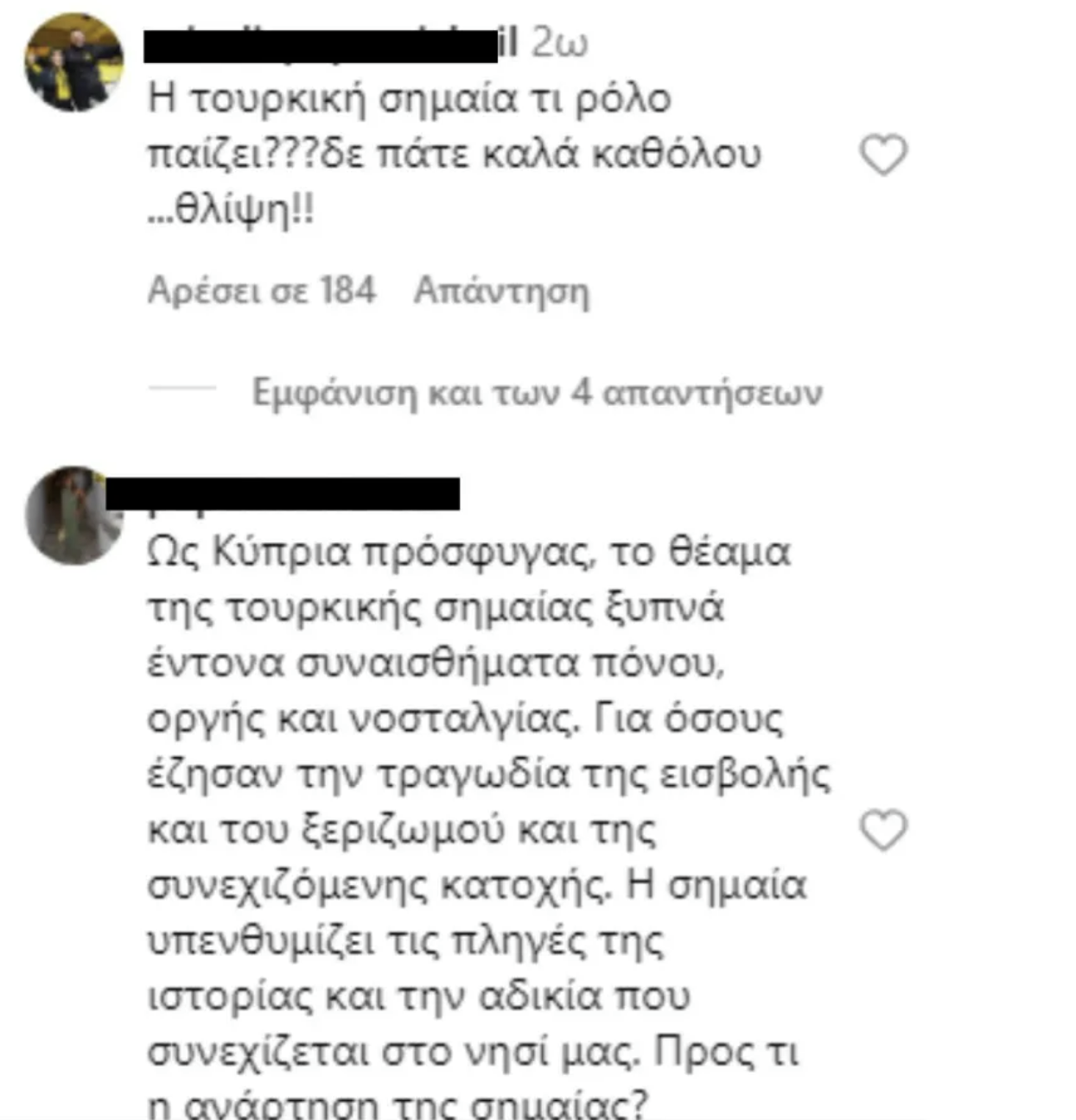 Μία ακόλουθος σχολίασε χαρακτηριστικά… «Ως Κύπρια πρόσφυγας, το θέαμα της τουρκικής σημαίας ξυπνά έντονα συναισθήματα πόνου, οργής και νοσταλγίας. Για όσους έζησαν την τραγωδία της εισβολής και του ξεριζωμού και της συνεχιζόμενης κατοχής. Η σημαία υπενθυμίζει τις πληγές της ιστορίας και την αδικία που συνεχίζεται στο νησί μας. Προς τι η ανάρτηση της σημαίας;»