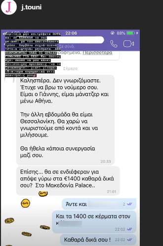 Το περιστατικό έκανε την Ιωάννα έξαλλη… Και απάντησε με έντονο τρόπο στον άντρα που τόλμησε να της κάνει αυτήν την προσβλητική και ανήθικη πρόταση. Η ίδια δημοσίευσε την συνομιλία τους και έγραψε… “Κορίτσια, μην επιτρέπετε κανένα και ΠΟΤΕ να σας μειώσει με οποιοδήποτε τρόπο. Λαμβάνω συχνά πυκνά τέτοια τέτοια “φτηνά” μηνύματα. ΔΕΝ ΠΛΗΡΩΝΟΝΤΑΙ ΟΛΕΣ ΟΙ ΩΡΑΙΕΣ ΓΥΝΑΙΚΕΣ ΓΙΑ… ΣΕΞ και όποιος έχει σκοπό να μου κάνε αντίστοιχες προτάσεις να το ξανασκεφτεί γιατί γίνομαι ιδιαίτερα ευρηματική στις απαντήσεις μου”