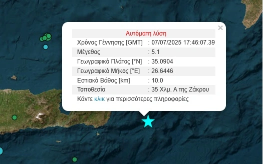 Ισχυρή σεισμική δόνηση μεγέθους 5,1 βαθμών της κλίμακας Ρίχτερ αναστάτωσε απόψε, στις 20:46, τη θαλάσσια περιοχή ανατολικά του νομού Λασιθίου στην Κρήτη. Ο σεισμός, αν και υποθαλάσσιος, έγινε αισθητός σε αρκετές περιοχές, προκαλώντας ανησυχία στους κατοίκους.