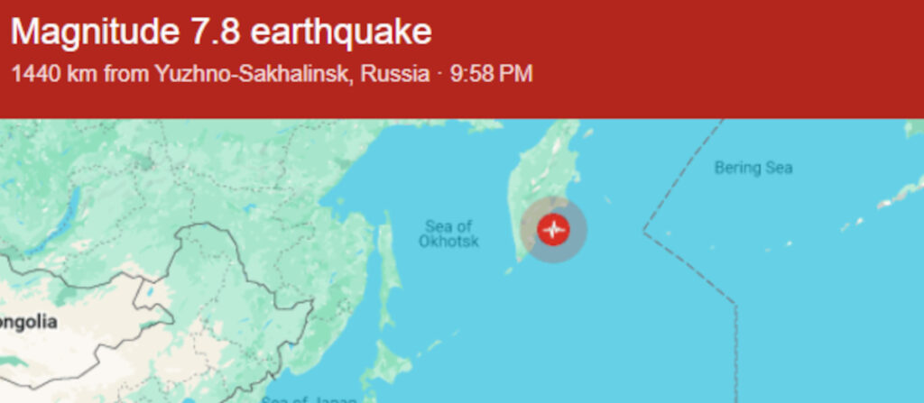 Magnitude 7.8 earthquake hits eastern Russia, just off Kamchatka’s coast.