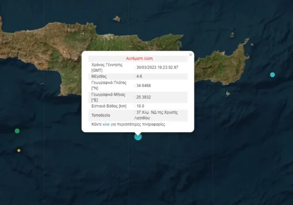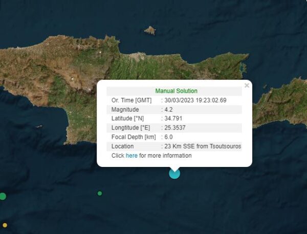Ο σεισμός σημειώθηκε 37 χλμ. νοτιοδυτικά της Χρυσής Λασιθίου και 68 χλμ από το Ηράκλειο. Το εστιακό βάθος εντοπίζεται στα 10 χλμ.