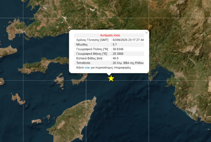 Μια ισχυρή σεισμική δόνηση μεγέθους 5,7 Ρίχτερ σημειώθηκε στα ανοιχτά της Ρόδου τις πρώτες πρωινές ώρες της Τρίτης, στις 02:17. Ο σεισμός έγινε αισθητός στο νησί και στην ευρύτερη περιοχή, προκαλώντας ανησυχία στους κατοίκους.