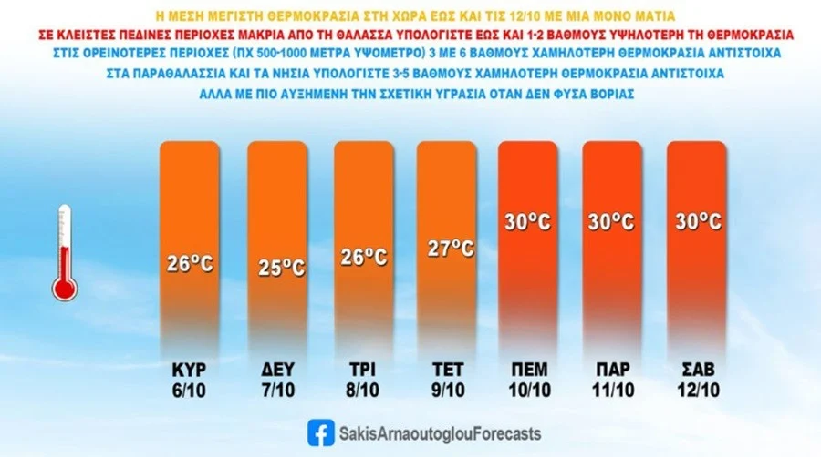Σύμφωνα με την ανάρτηση του Σάκη Αρναούτογλου, μετά την κακοκαιρία «Cassandra», οι θερμοκρασίες θα παρουσιάσουν άνοδο σε διάφορες περιοχές της Ελλάδας. Ο υδράργυρος αναμένεται να αγγίξει τους 30 βαθμούς Κελσίου. Ενώ στις πεδινές περιοχές οι θερμοκρασίες θα κυμανθούν από 28 έως και 33 βαθμούς Κελσίου μέσα στην εβδομάδα.